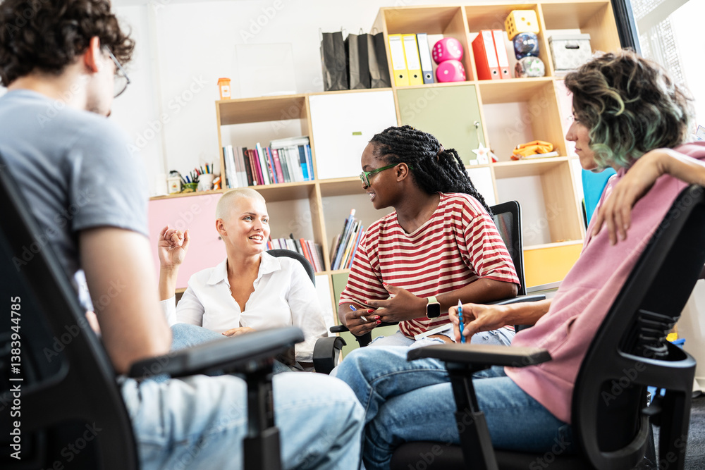 In a dynamic college office, a group of students brainstorming about education, culture, human rights, and race equality.
