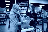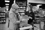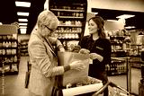 Happy cashier helping senior customer with packing groceries in paper bag at supermarket checkout.