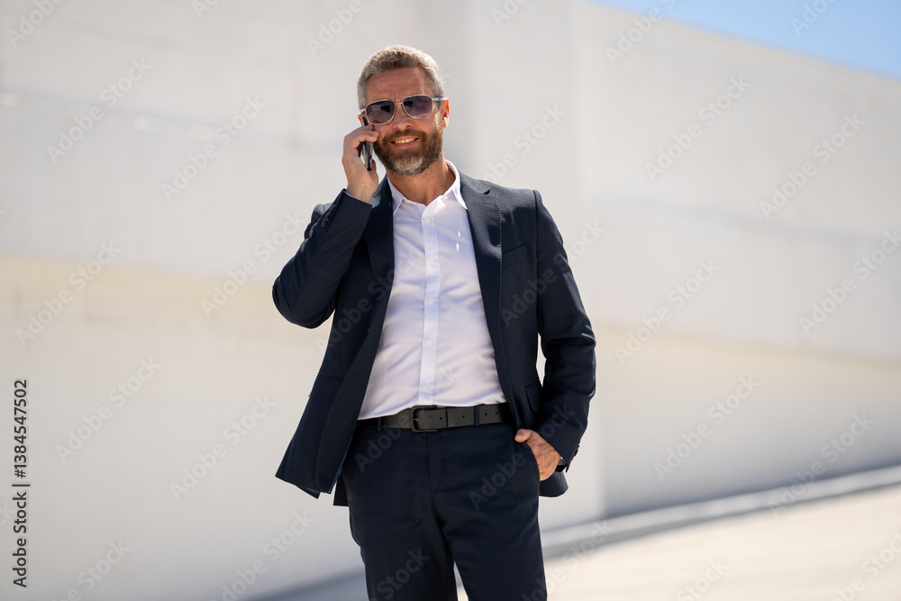 Office worker talking on cellphone outside. Businessman talk on mobile phone. Businessman having phone conversation. Stylish businessman using phone. Business call. Busy businessman talking on phone.