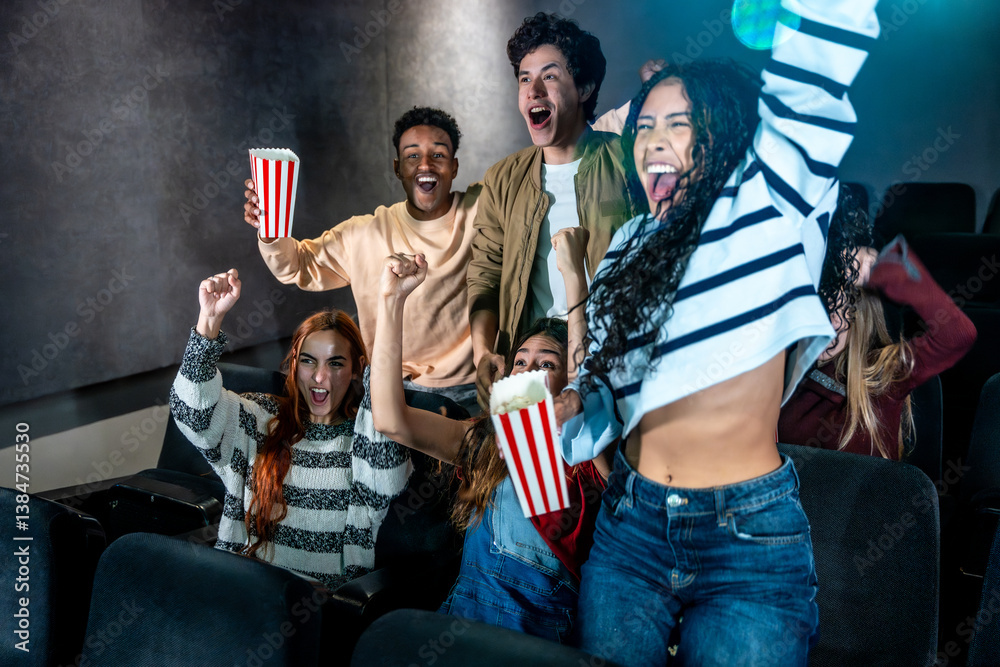 Young people cheering and watching a movie at the cinema
