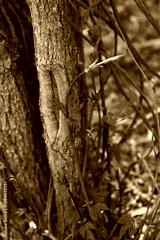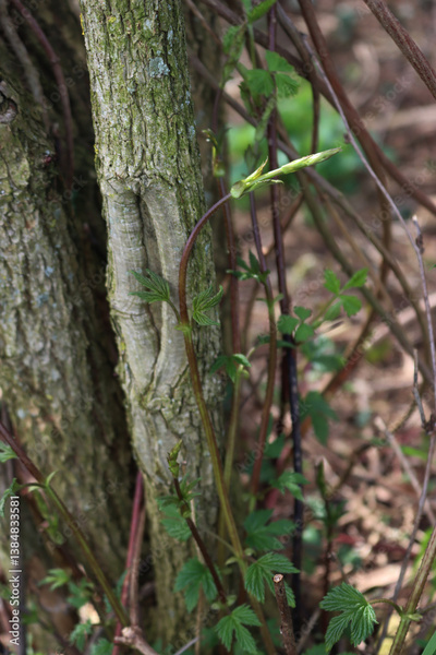 Edible Hop buds growing on a tree trunk in the italian countryside on springtime. Humulus lupulus