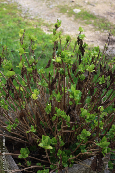 Hydrangea bush with fresh new green leaves in concret planter on springtime