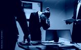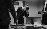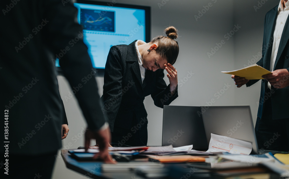 A group of business professionals facing challenges in a workplace environment, showcasing teamwork under pressure. The image highlights stress in corporate settings and the dynamics of problem