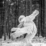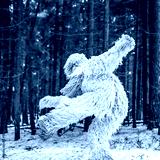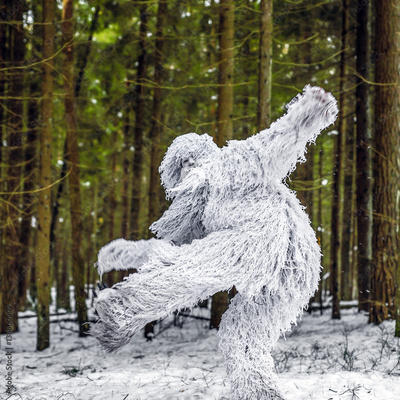 Yeti fairy tale character in winter forest. Outdoor fantasy photo.