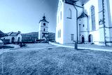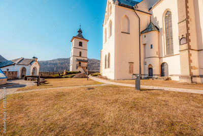 Historical town square in mining city Kremnica in Slovakia. View of the tower and church on the Kremnica castle.