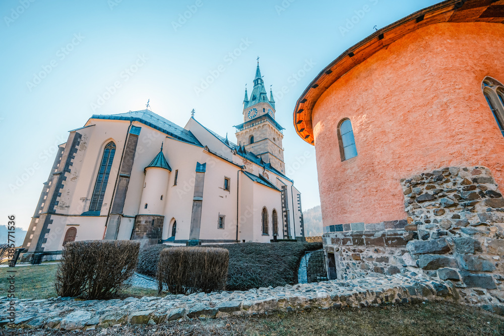 Historical town square in mining city Kremnica in Slovakia. View of the tower and church on the Kremnica castle.