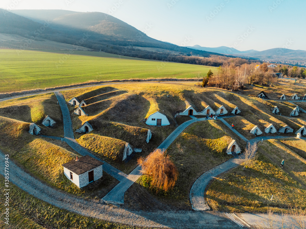 Traditional wine cellars in Hercegkut near Sarospatak Tokaj region Hungary. Button Hill.