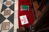 Polite Do Not Sit sign seen on the velvet seating of a famous English cathedral. The seating is for the large choir, hym books can be seen next to the sign.