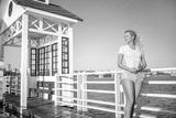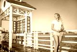 Smiling to the sun / Beautiful young woman with a take away coffee cup, standing on the bridge near the water.