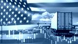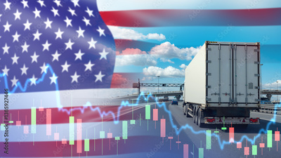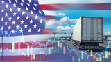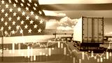Freight truck on a U.S. highway with American flag overlay and financial stock charts, symbolizing logistics, economy, and trade.