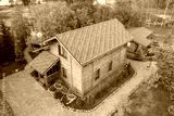 Vacation house. Two-story wooden home. Country cottage view from drone. Stone paved path around cottage. Country hotel in summer day. Suburban house in forest. Scandinavian style house