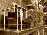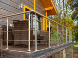 Terrace country cottage. Relaxation area on veranda of wooden house. Wicker chairs on terrace. Country cottage among trees. Country house with open-air terrace. Cottage veranda on concrete supports.