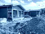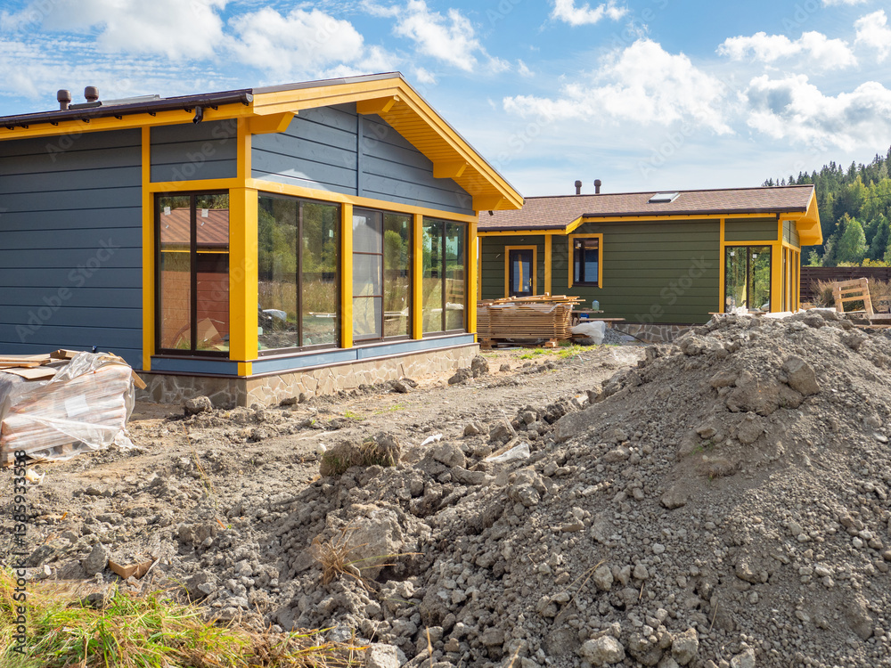 Construction of suburban village. Pile of earth near new mansions. One-story wooden houses with panoramic windows. Erection of country village. Property under construction far from city