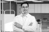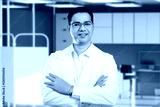 Man doctor stands with arms crossed. Young medic smiles and looks at camera. Head physician of clinic in white coat. Man doctor inside blurred office. Successful doctor with glasses