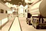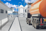 Fuel truck near oil factory. Truck with tank for transporting gasoline. Fuel factory under blue sky. Rear view of fuel tanker delivering petroleum. Territory of oil plant. Petroleum manufactory