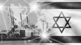 Israel seaport. Freight harbor on ocean. Cranes for loading containers onto ship. Israel flag near sea harbor. Infrastructure for maritime logistics. Delivery of goods from Israel across ocean