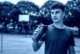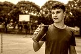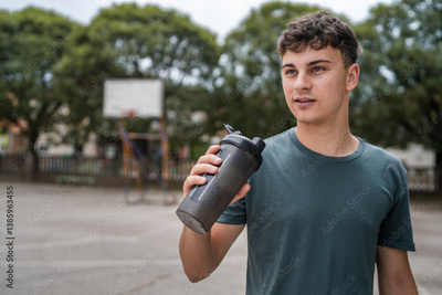 one young caucasian man teenager hold supplement shaker stand outdoor