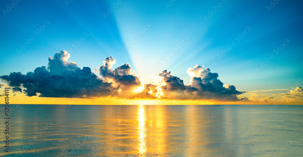 Sea sunset with cloudy sky and sun through the clouds over. Clouds Ocean and sky background, seascape.