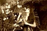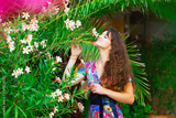 beautiful brunette woman in a colorful dress standing in the green garden among palm trees and flowers