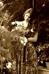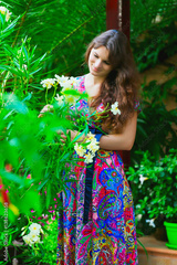 beautiful brunette woman in a colorful dress standing in the green garden among palm trees and flowers