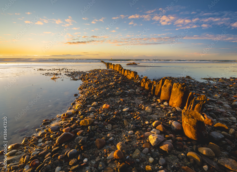 Baltic sea at beautiful sunrise,wooden breakwater in the light of the setting sun