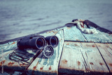 Travel concept, compass, sand and rope on wooden background