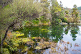 some of the clearest ponds at Te Waikoropupū Springs and river, near Takaka, Tasman District, northern South Island, New Zealand, surrounded by lush native vegetation