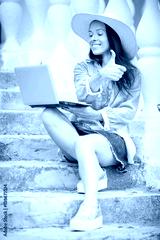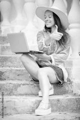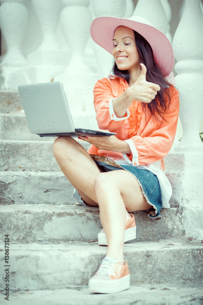 attractive young woman using laptop sitting on wooden staircase enjoying sunny day outdoors