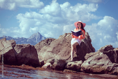 Happy woman enjoying beach relaxing joyful in summer by tropical blue water.