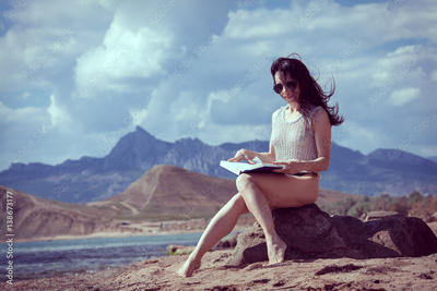 Happy woman enjoying beach relaxing joyful in summer by tropical blue water.