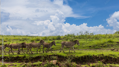 Several donkeys in lush green landscape of Ngorongoro conservation area in Tanzania