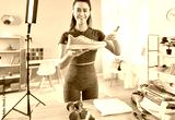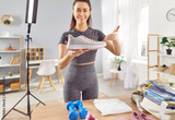 Fit sporty young woman fitness model blogger making commercial social media marketing collaboration integration with sports footwear brand, filming promotion video, holding and showing shoe at camera