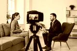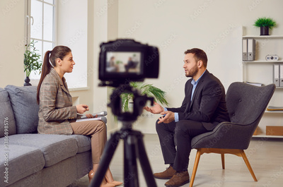 Camera close up, successful business people recording video, using digital camera in office or home, freelancer, modern blogger, business coach making content, using professional equipment, talking