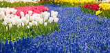 Flower garden. Keukenhof colorful Flowers. Lisse Netherlands. Blue muscari flowers with tulips in beds at the Keukenhof in Lisse, Netherlands.