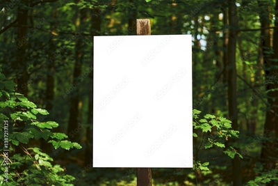 Blank white sign on wood pole in green forest with copyspace