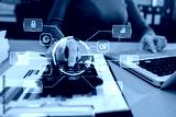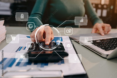 Woman accountant use Laptop and calculator to calculate the company's financial with icon banking on data network