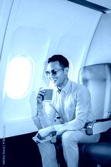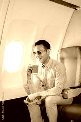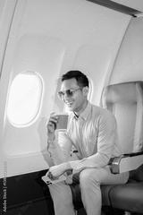 Asian man sitting in a seat in airplane and looking out the window going on a trip vacation travel concept. using a phone, laptop with grace.Capture the allure