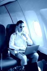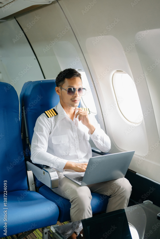 Asian Confident male pilot in uniform leaning at the passenger seat while standing inside of the airplane flight cockpit during takeoff