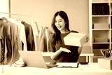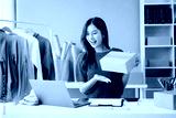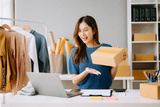 Woman using smartphone or tablet taking receive and checking online purchase shopping order to preparing pack