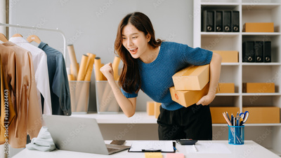 Woman working at office, BOX, tablet and laptop online, marketing, packaging, delivery, e-commerce concept