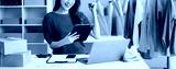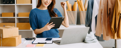 Woman working at office, BOX, tablet and laptop online, marketing, packaging, delivery, e-commerce concept