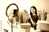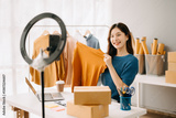 Beautiful Asian lady blogger showing clothes in front of the camera to recording vlog video live streaming