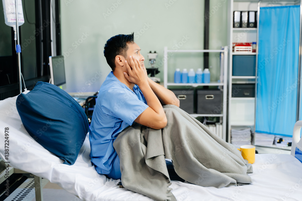 Concerned patient in a hospital bed, capturing emotions tied to medical care, recovery,