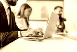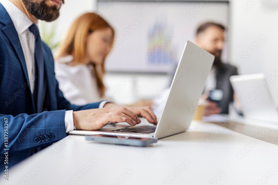 Close up of businessman's hands typing on laptop during the meeting in meeting room.