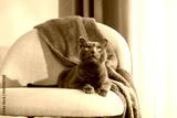 A grey cat sits calmly on a beige modern chair with a draped blue throw. The scene is bathed in soft natural light.