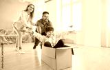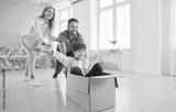 Happy family couple with child boy on moving day having fun in new apartment riding son in cardboard box. Home owners enjoying buying house or flat. Relocating, real estate, mortgage concept.