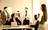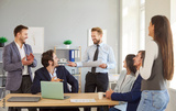 Friendly business people working together in an office during a team meeting, conference, or presentation. Showcasing community, teamwork, and professional collaboration in the workplace.
