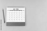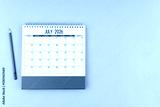 July desk calendar for 2026 year with pencil on blue background, Position with copy space.