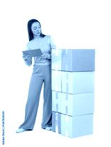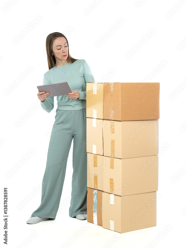 Woman in a mint green outfit checking tall stack of cardboard boxes while holding a tablet, representing warehouse work, shipping, or inventory control.