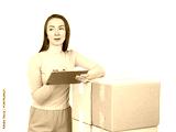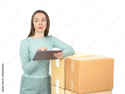 Woman in a mint green outfit leaning on cardboard boxes and using a tablet, symbolizing inventory check, logistics coordination, or warehouse task.